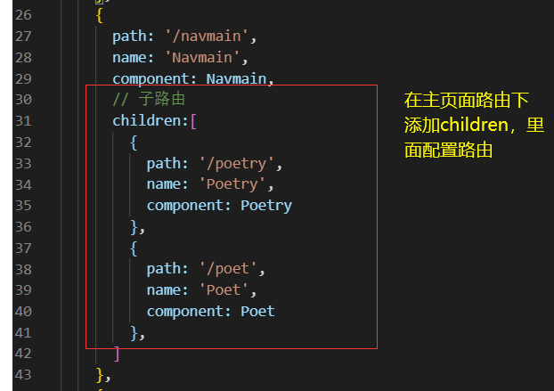 5.在配置好子路由后,就可以在導(dǎo)航菜單欄中使用,使用時只需對index設(shè)置需要跳轉(zhuǎn)頁面路徑就行了,如下圖: